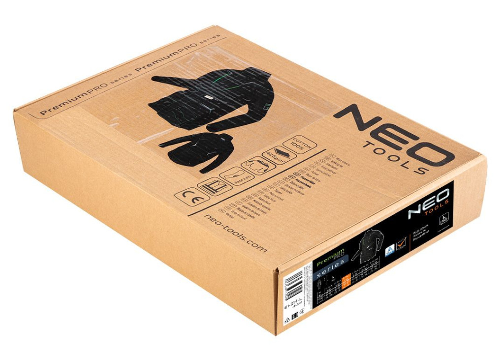 A NEO Premium PRO munkadzseki 100% Canvas pamut-425 g/m2 súlyú szövetből készül.A vállakon,a háton, az ujjakon és a zsebeken Cordura NYCO megerősítésekkel, ezért a dzseki ellenállóbb a mechanikai sérüléseknek. A munkadzseki fekete színű és kontrasztos neonzöld színnel van kombinálva. Elasztikus hálós béléssel, YKK cipzárral és 3M fényvisszaverő nyomatokkal rendelkezik. 12 zseb található rajta: 2 cipzáras mellzseb, 6 cipzáras-mágneses nyomógombos zseb, 2 kenguru típusú zseb és 2 további zseb a pulóver alján. A munkadzseki YKK fő cipzárját praktikus takarás fedi. A munkadzseki hosszúkás hátulja, valamint a belsejében cipzárral varrt rugalmas derékpánt lehetővé teszi, hogy a sorozatból származó nadrággal teljes öltözékké kombinálható legyen. Az ujjak alja belülről rugalmas anyaggall vannak ellátva. Megtalálható rajta egy tépőzáras tapasz is, amelyre saját logóját rögzítheti. Az azonosító címke megkönnyíti a munkahelyi azonosítást. A NEO márkát szakemberek és barkácsolók számára ajánljuk.